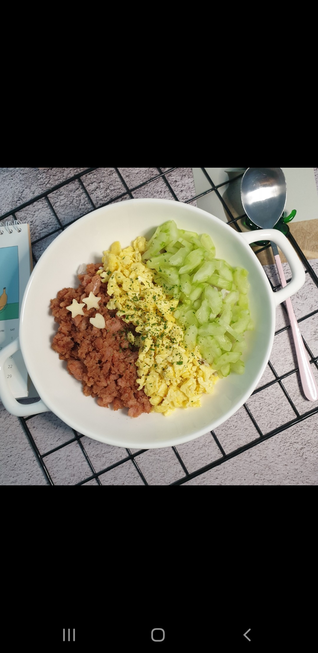 これで全ての準備が整いました!塩もみして水気をしっかり絞ったきゅうりはそのまま使います。温かいご飯の上に、炒めたスパム、ふんわりとしたスクランブルエッグ、シャキシャキのきゅうりを彩りよく盛り付ければ、見た目も楽しい三色そぼろ丼の完成です。どうぞ召し上がれ!