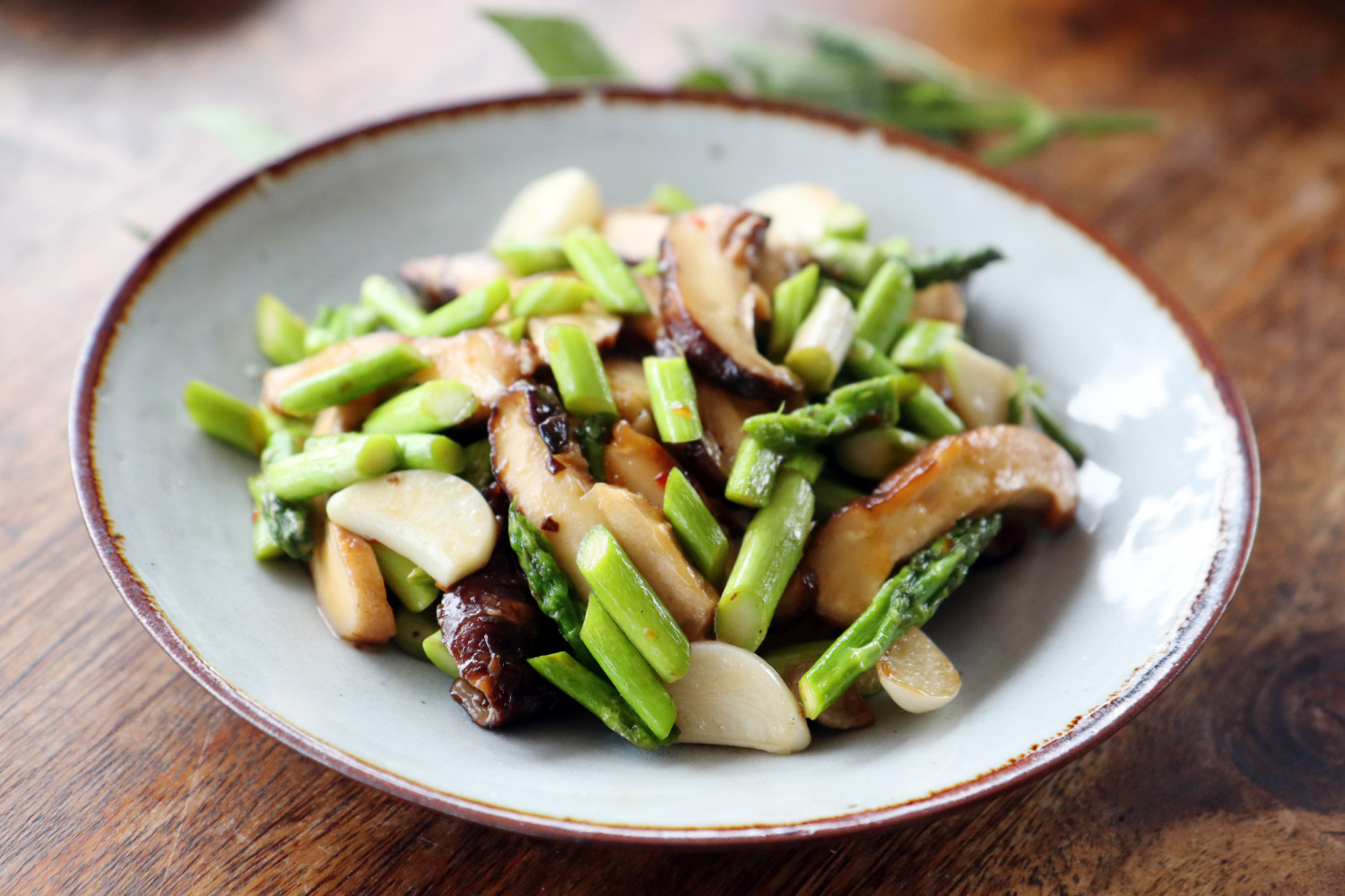 食感が良い椎茸は、食べやすいように細切りにします。椎茸の持つ風味と食感が、アスパラガスと素晴らしいハーモニーを奏でます。