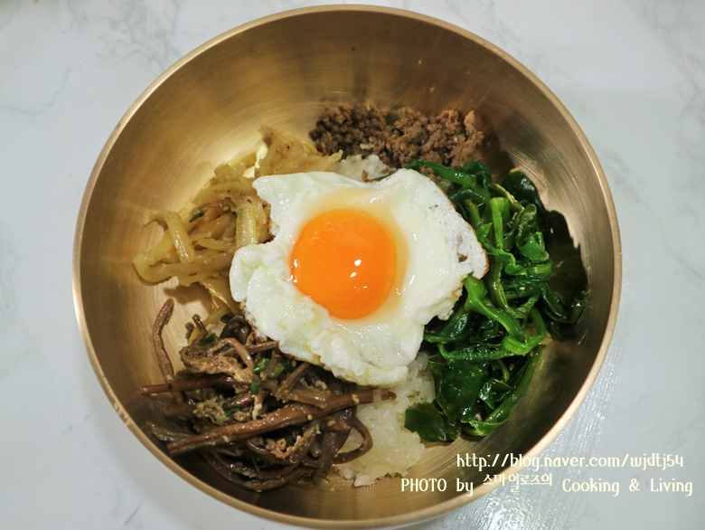 お正月にたくさん作って少し残ったナムルがあれば、その美味しいナムルを使い切って素晴らしいビビンバにしませんか?特に今年はほうれん草の値段が高く、より一層貴重に感じられたので、その風味を生かした三色ナムルビビンバは格別です。残ったナムルと少量の豆苗を添え、ご飯の量は普段の半分でも、満足感があり、味も最高です。冷蔵庫の残り物を活用するのにぴったりで、センスの良い方法です。