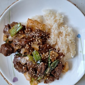 最後に、火を強火にし、30秒〜1分ほどサッと炒めてソースの香ばしさを引き出します。焦げ付かないように注意してください。火を止め、粗挽き黒こしょう小さじ1を全体に振りかけます。温かいごはんを盛ったお皿の上に、カットステーキを彩りよく盛り付けましょう。