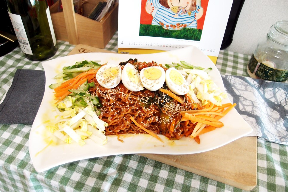 大きめの盆(トレイ)に、ソースと和えたチョルチョル麺をきれいに盛り付けます。その上に、半分に切ったゆで卵を乗せます。盆の周りには、準備したきゅうりの千切り、人参の千切り、白菜の千切りを彩りよく並べます。最後に、炒りごまを振りかけ、ごま油をひと回しかければ、彩り豊かな野菜がたっぷりの、ボリューム満点なチョルチョル麺のチャプチェ風の完成です!