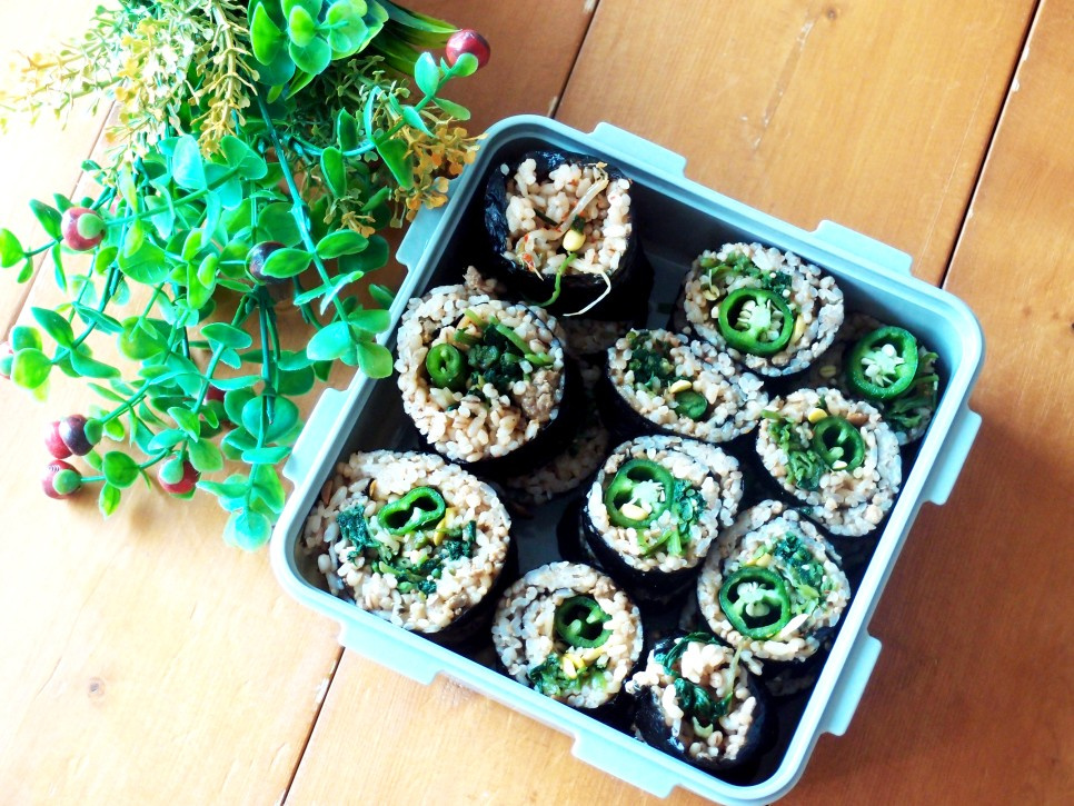 彩り野菜と豆味噌のヘルシーキンパ、ピリ辛きゅうりを添えて