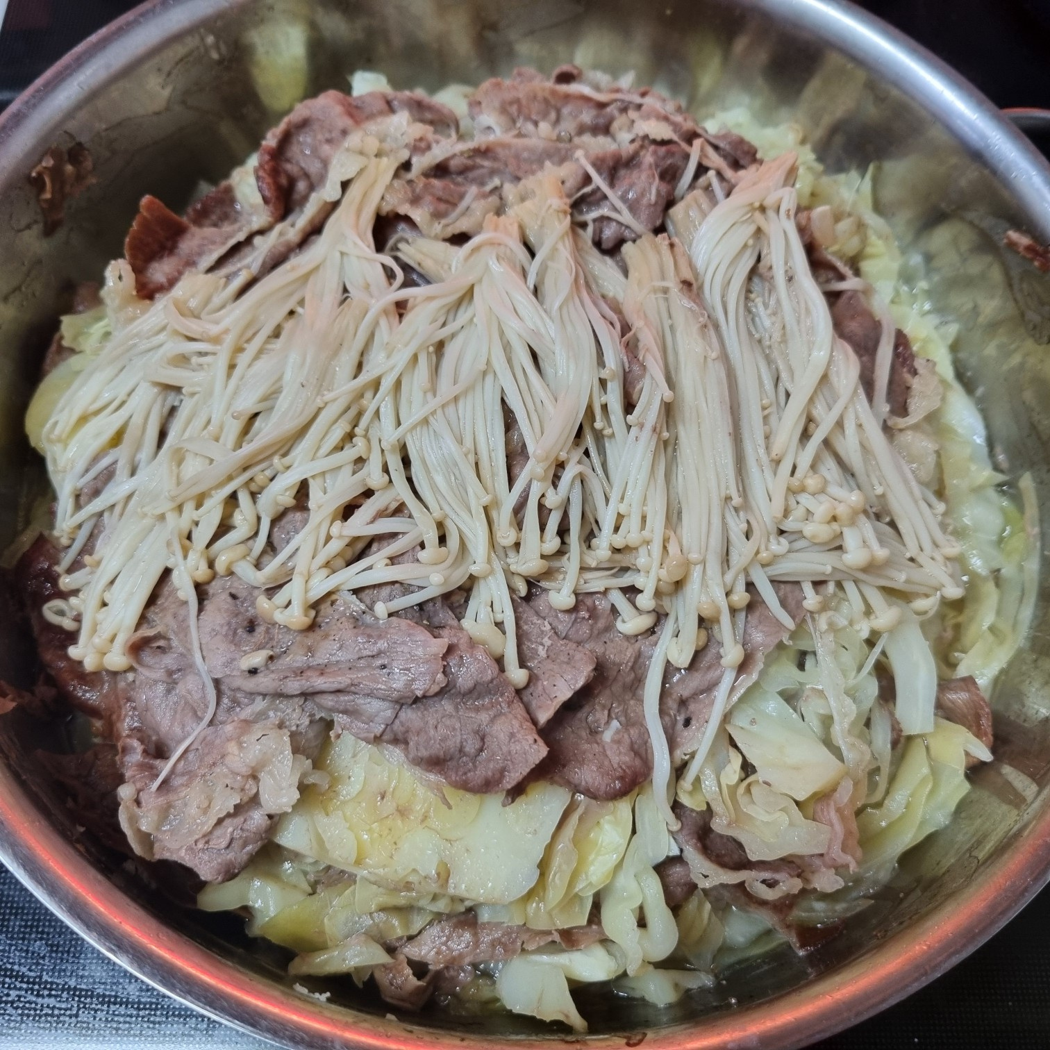 最後に、ほぐしておいたえのき茸を彩りよく乗せ、用意した日本酒半量を全体に回しかけます。日本酒のアルコール分は、お肉の臭みを効果的に取り除き、具材をさらに柔らかくする効果があります。鍋に蓋をして、弱めの中火で約15分間、じっくりと蒸し煮にします。牛肉にしっかり火が通るまで、十分に加熱してください。