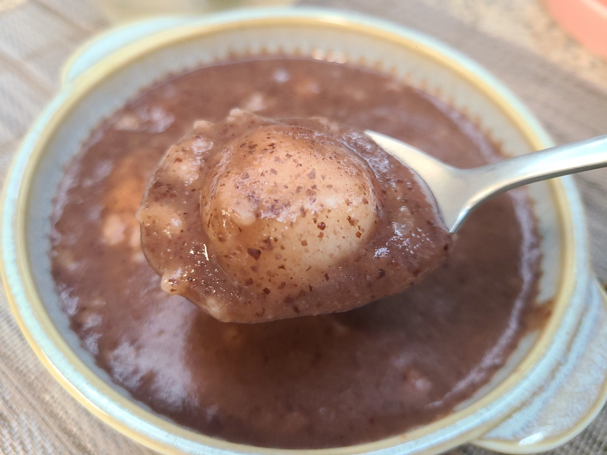最後に、茹でた白玉(オンシミ)をお粥に加え、さらに約5分煮込みます。白玉がお粥の味を吸うようにします。もし塩や砂糖を追加したい場合は、この最終段階の前に加えて、必ず5分以上しっかり煮込んでください。これで、温かく満足感のある冬至小豆粥(パッチュク)の完成です!