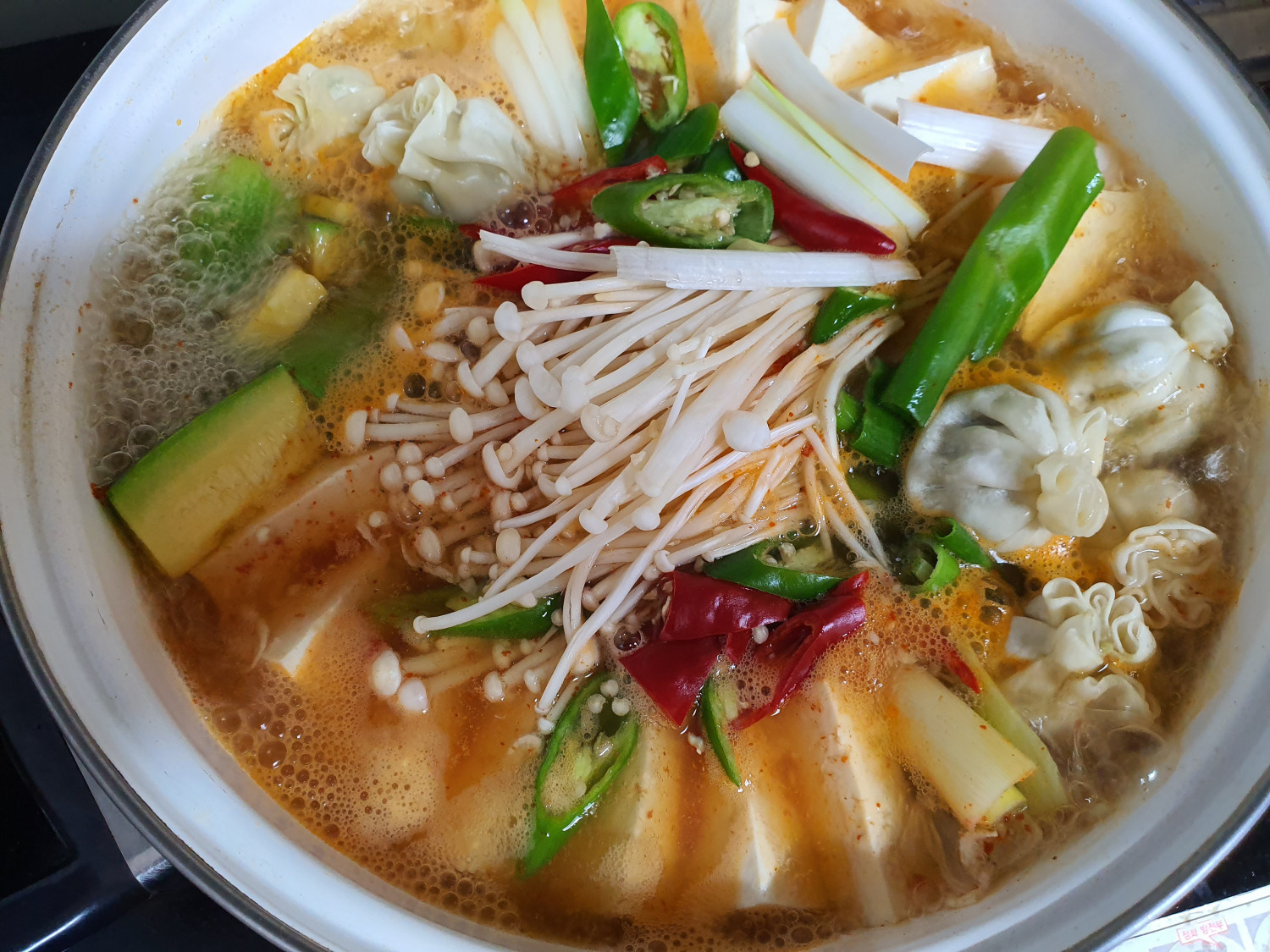 ここで、満足感を高めるミニマンドゥ10個を加えます。そして、最後の調味料、ニンニクみじん切り大さじ1も一緒に加えて煮込み始めます。全ての具材が調和し、美味しいチゲが完成するはずです。