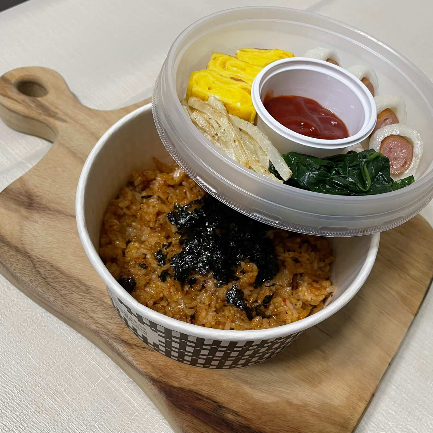 忙しい現代人にぴったりの一品、キムチチャーハンをメインに、冬の味覚である甘みのある大根ナムルと新鮮なほうれん草ナムルを添えました。栄養バランスを考え、良質なたんぱく質源であるふわふわ卵焼きと、老若男女に愛されるもちもち食感の「ソットクソットク」(餅菓子)も加えた、彩り豊かで満足感のあるお弁当です!