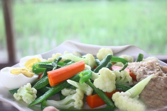 サラダの野菜を準備しましょう。インゲンは食べやすい長さに切り、人参は薄切りにします。カリフラワーは一口大に分けます。沸騰したお湯でこれらの野菜をさっと茹で、冷水にとって冷ますと、よりシャキシャキとした食感が楽しめます。