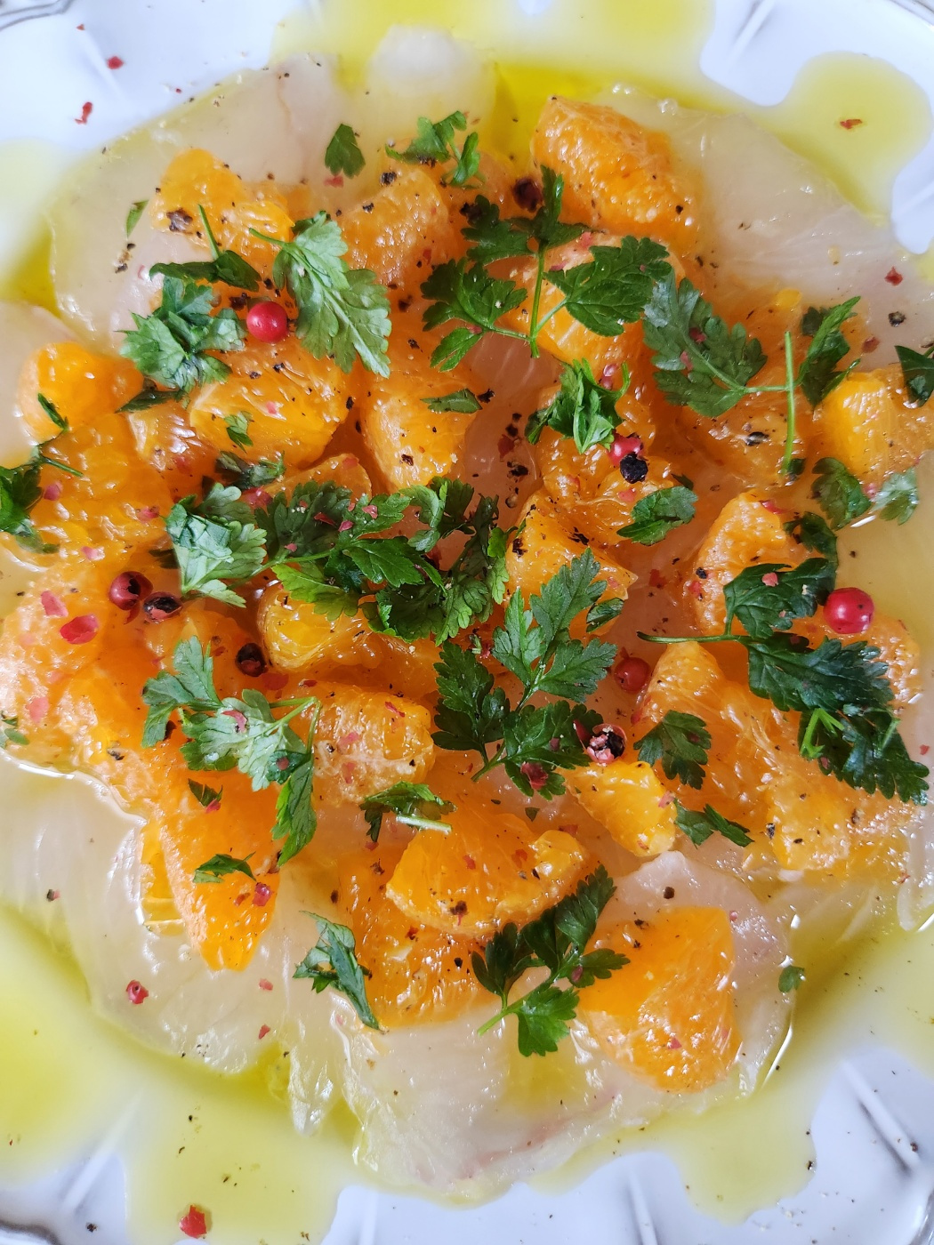 最後に、新鮮なチャービルの葉を指でちぎって飾り、お好みで赤唐辛子フレークを軽く散らせば、美味しいカンパチのカルパッチョの完成です!とても簡単でしょう?特別な日やホームパーティーのデザート、ワインのお供にぜひお試しください!