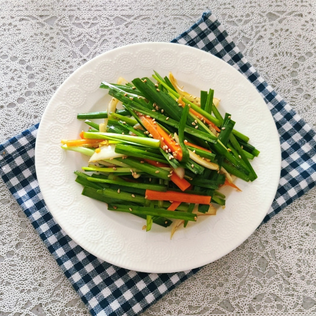 最後に、見た目も美味しい炒りごまをパラパラと振りかけたら、シャキシャキで美味しいニラのおひたし、ニラキムチのレシピの完成です!どうぞ召し上がれ。