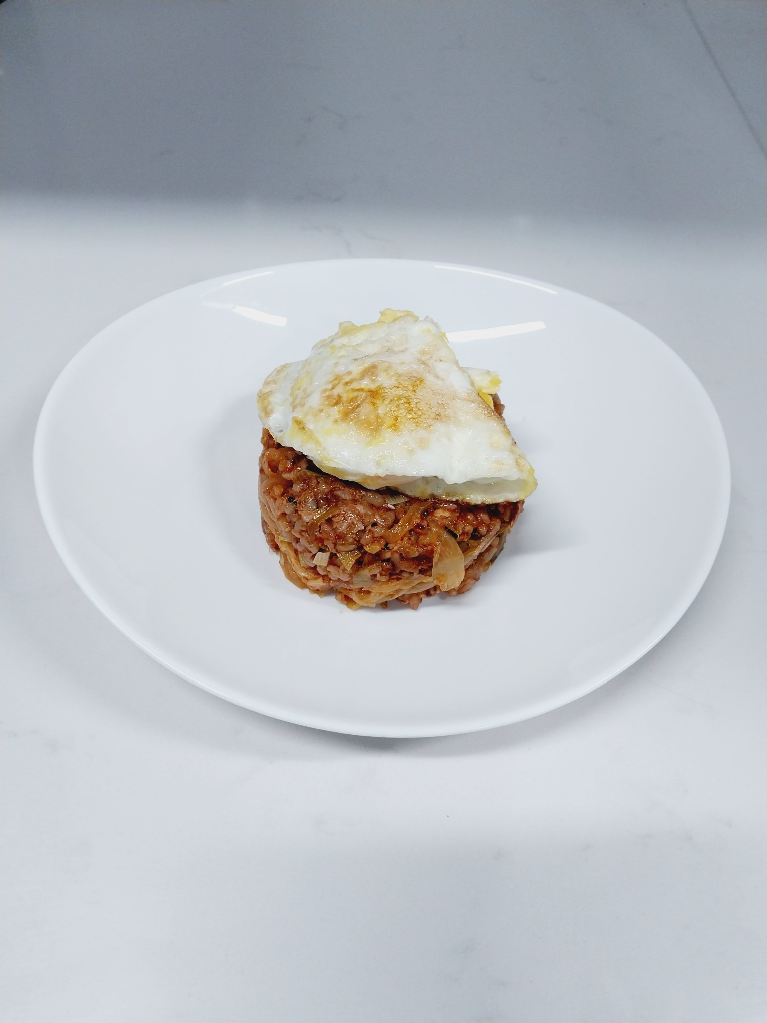 出来上がったキムチチャーハンをお皿に盛り付けます。最後に炒りごま大さじ1を振りかけ、目玉焼きを乗せれば、美味しいツナキムチチャーハンの完成です!熱々を召し上がれ!