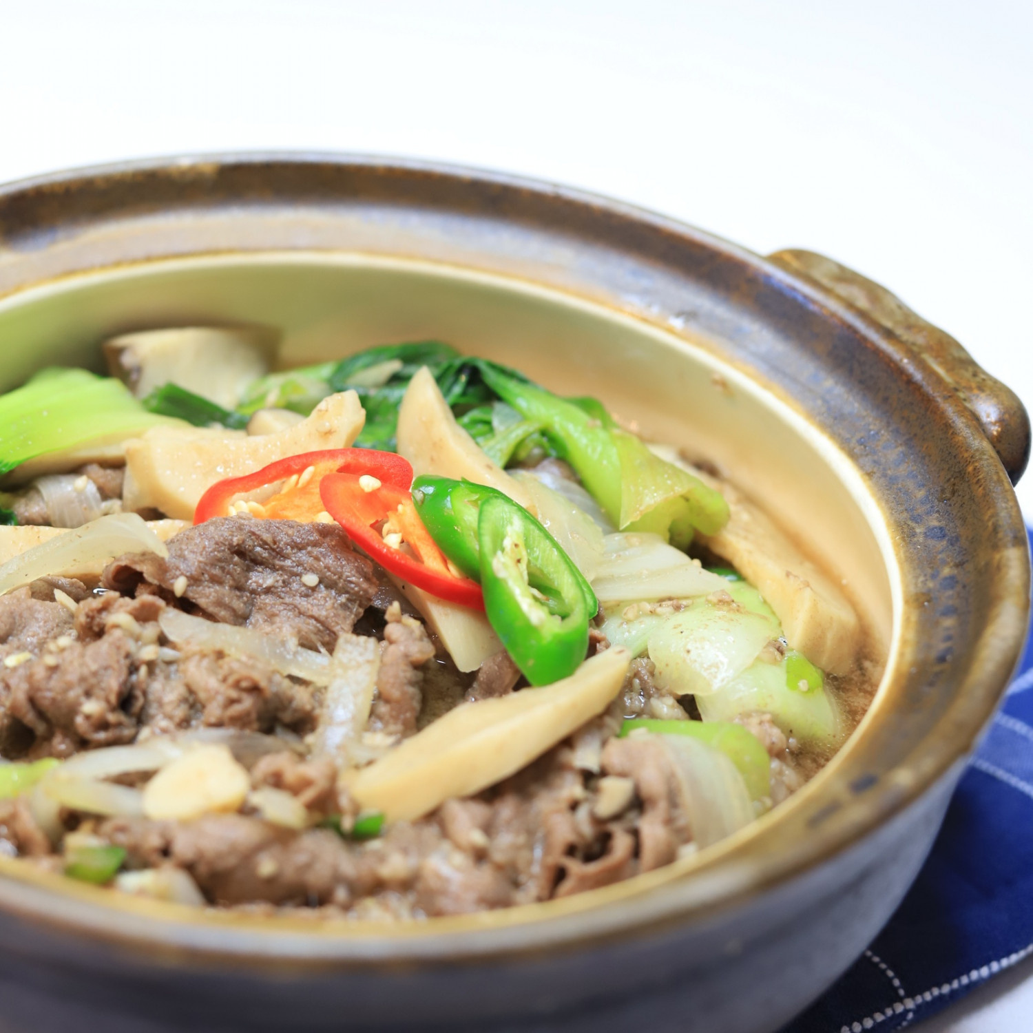 よく煮出した出汁を鍋に注ぎ、準備した牛肉と野菜、きのこを彩りよく盛り付けます。いよいよ火にかけて煮込み始めましょう。