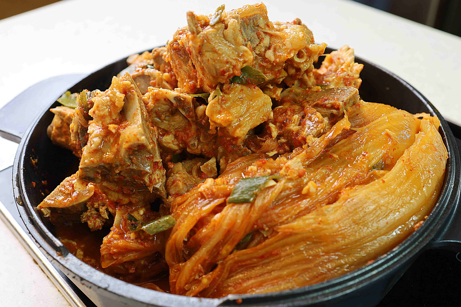 深めの鍋の底に、食べやすい大きさに切った熟成キムチを敷き詰めます。その上に茹でた背骨をきれいに並べ、あらかじめ混ぜ合わせておいた調味料を背骨全体に均等にかけます。最後に、キムチの汁1/2おたま、準備しておいた背骨のスープ2おたまを注ぎ入れ、蓋をします。中火で10分ほど煮立たせ、煮汁が少なくなってきたら弱火にし、さらに10〜20分ほど煮込み、キムチと背骨がよく馴染むように火を通します。