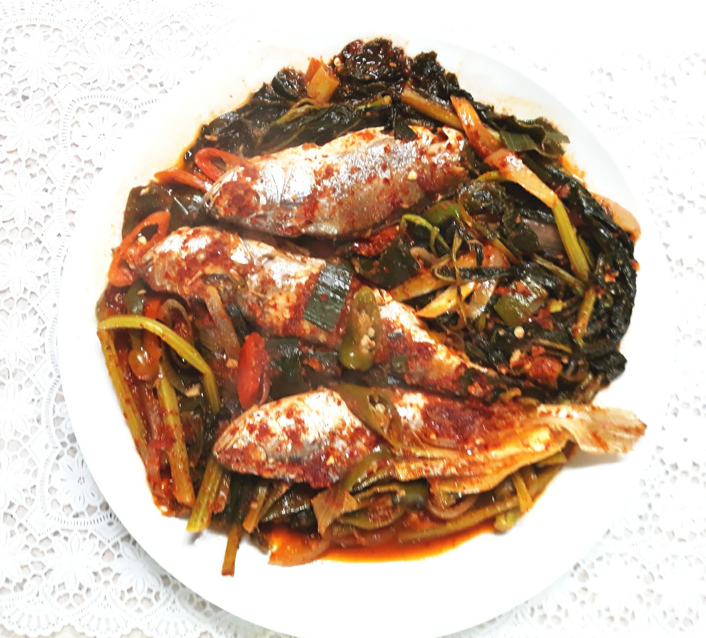 鍋の底に、調味料で和えた菜の花を均一に広げて敷き詰めます。その上に準備したイシモチをきれいに並べ、カットした長ネギ、玉ねぎ、唐辛子をたっぷりと乗せます。残りの合わせ調味料をすべてかけ、昆布だしを具材がひたるくらいまで注ぎ入れます。蓋をして、強火で煮込み始めます。