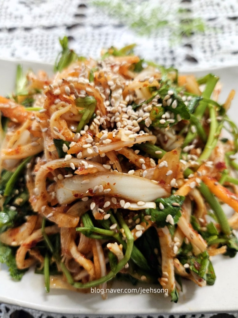 最後に、香ばしさを加える白ごまをたっぷり振りかけたら、風味豊かで美味しいミナリと乾燥イカの和え物の完成です。ご飯のおかずにも、お酒のおつまみにもぴったりなので、ぜひ味わってみてください!