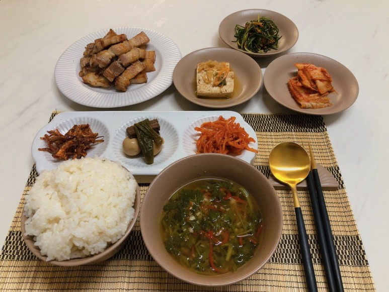 心を込めて作ったよもぎ味噌チゲに、いくつかのおかずを添えれば、豪華で食卓が華やぎます!今日の夕食は、この香ばしいよもぎ味噌チゲで、春の訪れを存分に味わってみてください。
