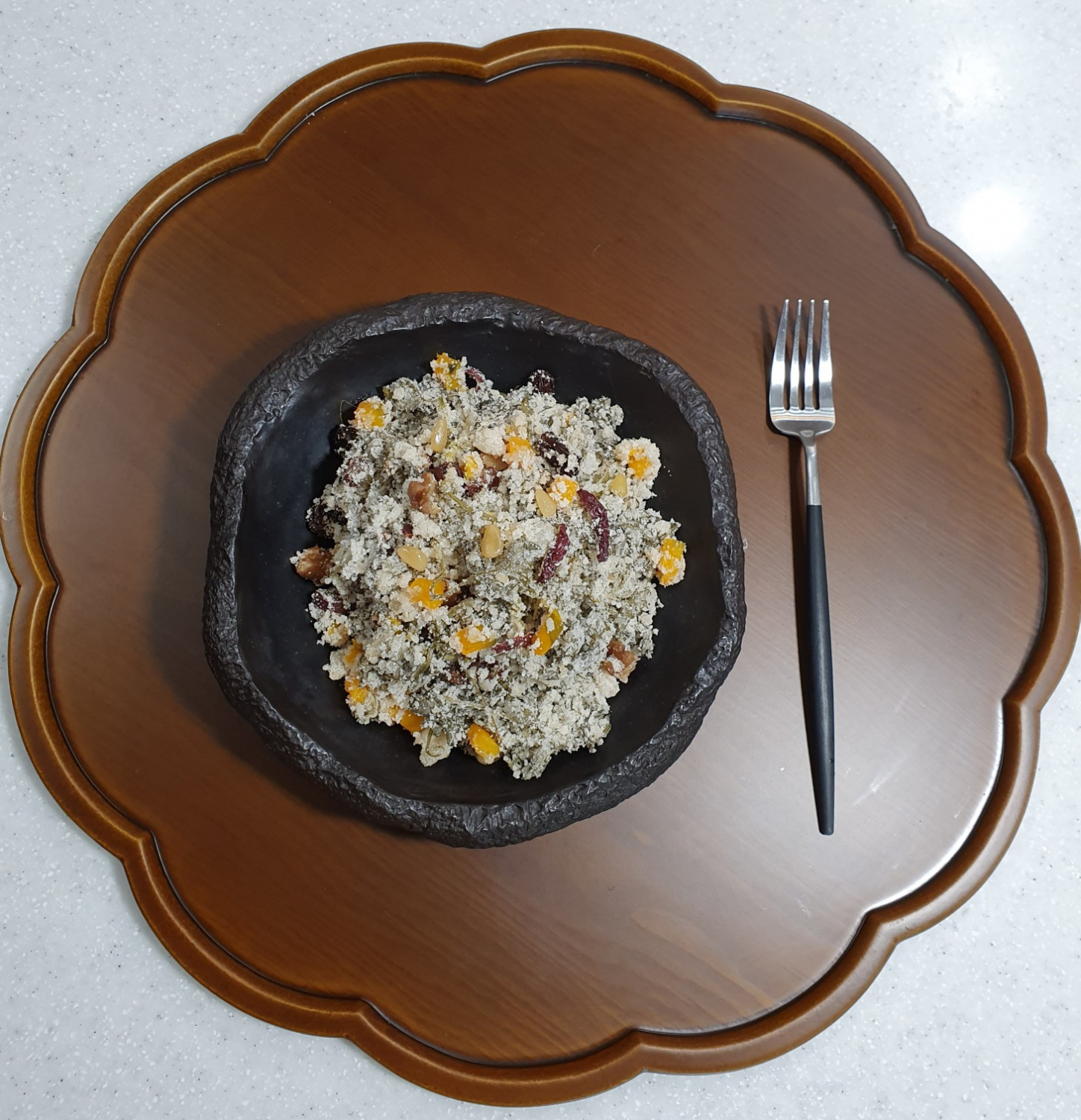 混ぜ合わせたヨモギと米粉の生地の上に、準備したカボチャ、松の実、くるみ、レーズン、細切りナツメをすべて加えます。材料が固まらないように注意しながら、均一に混ぜ合わせてください。全ての材料が均等に混ざることが重要です。
