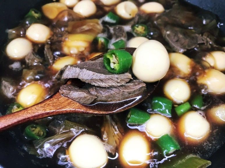 丹精込めた有機韓国産牛バラ肉と鶉卵の醤油煮込み