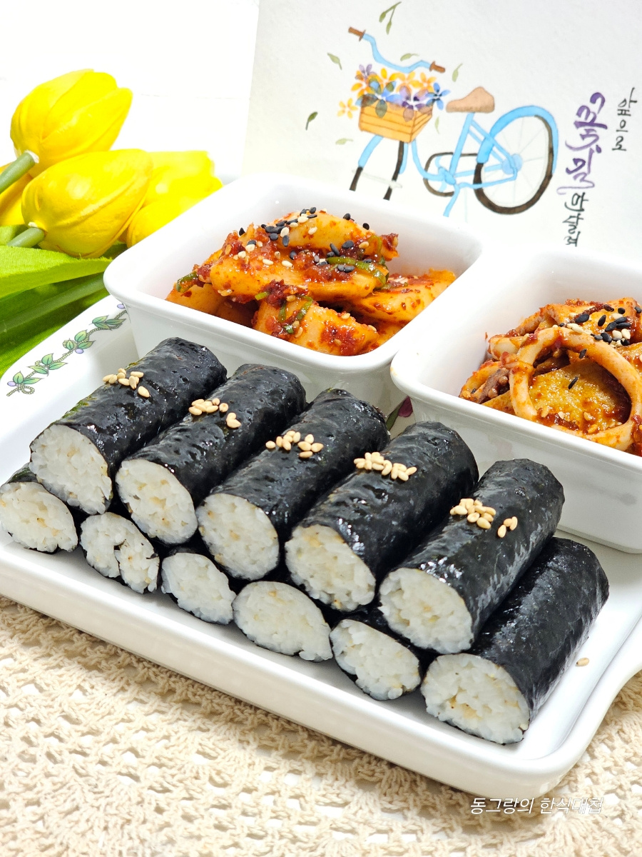 本場の味!チャムンギムパ(忠武김밥)の作り方:イカの和え物と大根キムチ添え