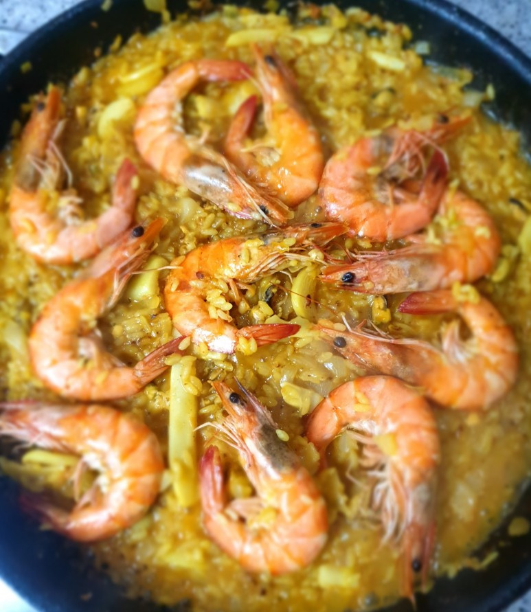 蓋をして、弱火で約15〜20分、お米が完全に炊けて水分が飛ぶまで炊き上げます。炊いている間は、絶対にかき混ぜないでください!お米の底が少しおこげのように香ばしくなると、さらに美味しくなります。水分が完全に蒸発し、お米がパラパラに炊きあがったら、美味しいシーフードパエリアの完成です!