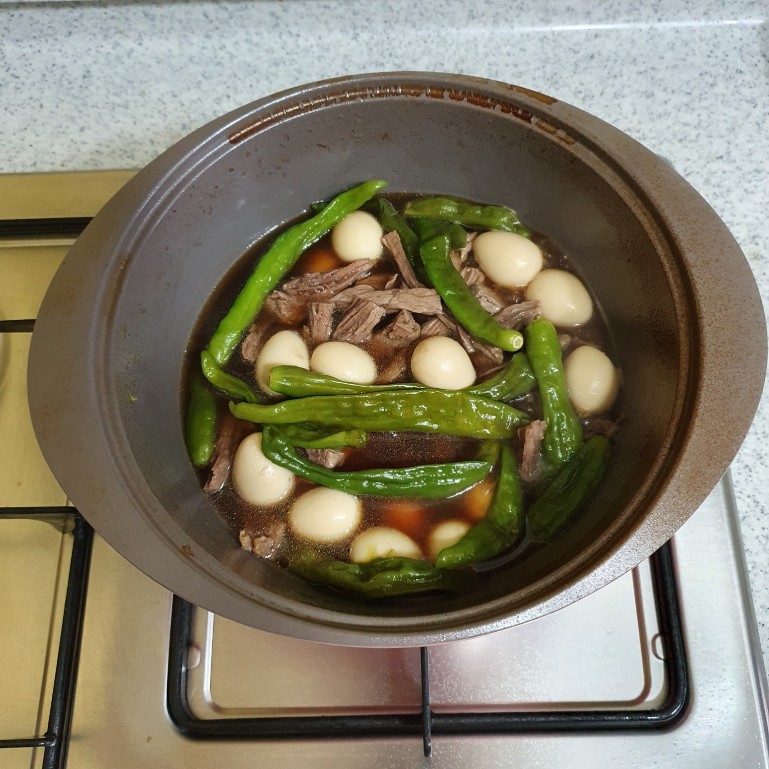 準備しておいたきれいなだし汁に、韓国だし醤油大さじ3、濃口醤油大さじ4、砂糖大さじ2を加えてよく混ぜ、煮込みダレを作ります。(甘さは好みで加減してください。)鶉卵を加えて中火で煮立たせ、卵に色が均一についてきたら、ほぐした牛肉とししとう(ヘタを取り半分に切る)を加えます。材料がタレとよく絡むように、中火でじっくりと煮詰めます。タレが程よく煮詰まり、材料にツヤが出たら完成です!