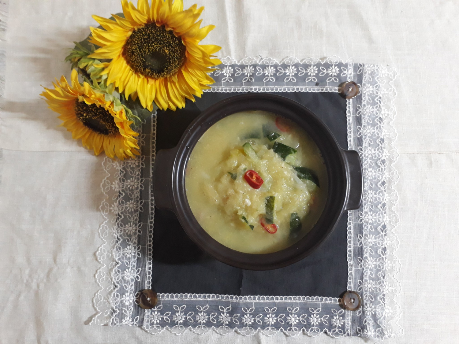 ズッキーニが十分に柔らかく煮えたら、切った玉ねぎと、お好みで赤唐辛子(または激辛唐辛子)を加えてさらに一煮立ちさせます。最後にエゴマ油大さじ2を回し入れて香りを加え、玉ねぎが少ししんなりする程度に1〜2分さらに煮て完成です。お好みで味を見て、薄ければエビ味噌を足して調整してください。