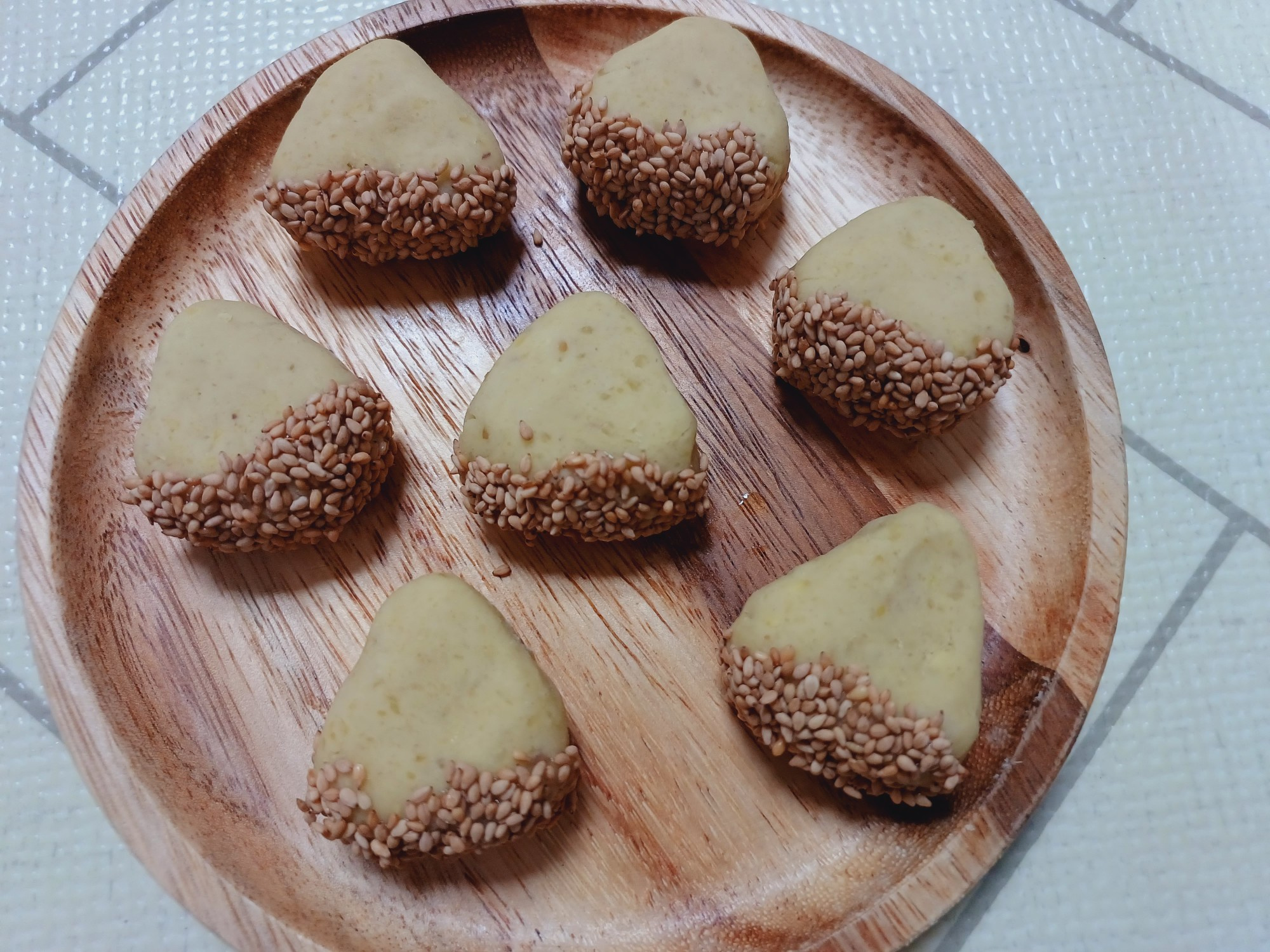 作った栗の形のユランの底の部分に、準備したはちみつを少量つけます。薄くコーティングするように塗ることで、白ごまがよくつきます。