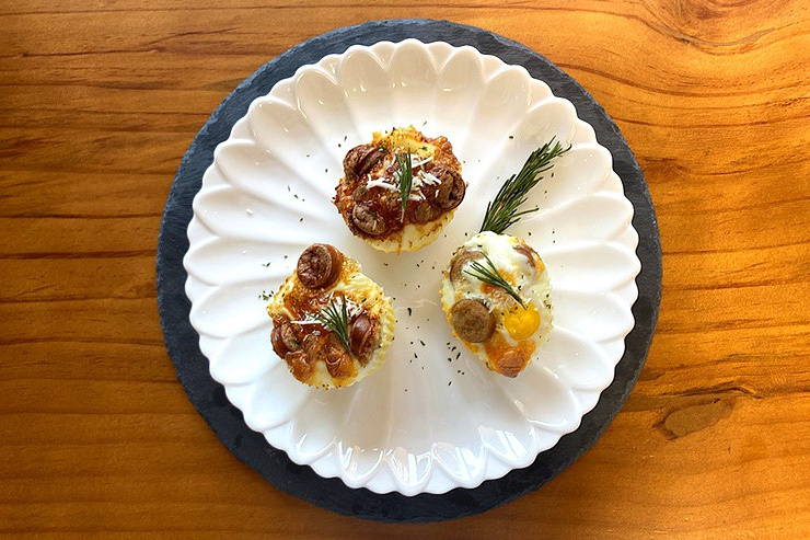 焼きあがった卵パンの上に、パセリのみじん切りとチーズパウダーを軽く振りかけて飾りましょう。(ローズマリーのようなハーブを添えても、香りが良くなりますよ!)