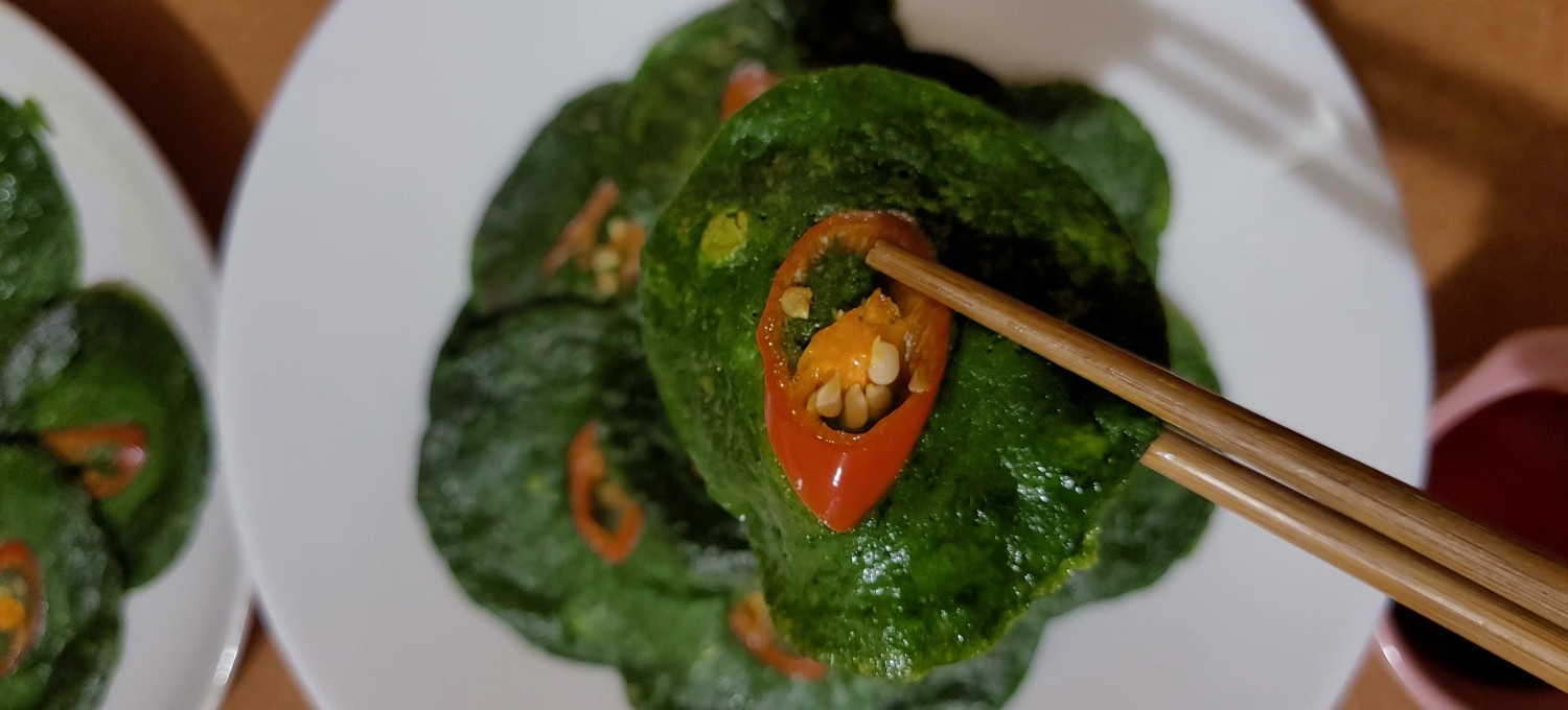 赤唐辛子を乗せたほうれん草チヂミは、見た目も美しいだけでなく、ピリッとした風味を加えてくれます。よく焼けたほうれん草チヂミを、甘酢醤油(醤油、酢、砂糖少々を混ぜたもの)につけて食べると、ほうれん草の青臭さは全くなく、香ばしくてあっさりとした味わいが絶品です。温かいうちに召し上がることをお勧めします!
