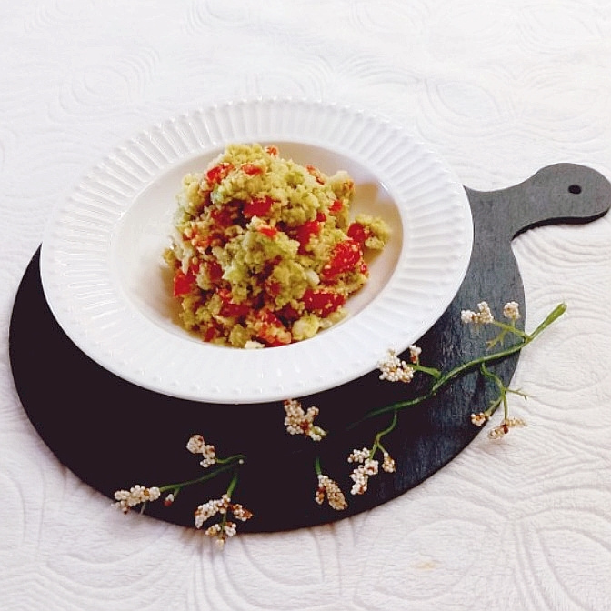潰したアボカドに、準備したミニトマトと玉ねぎを加えます。ここで味のバランスをとるために、塩小さじ1/2、オリーブオイル大さじ1、レモン汁大さじ1(レモン汁がなければ酢で代用)、そして挽きたての黒こしょうを少々加えます。