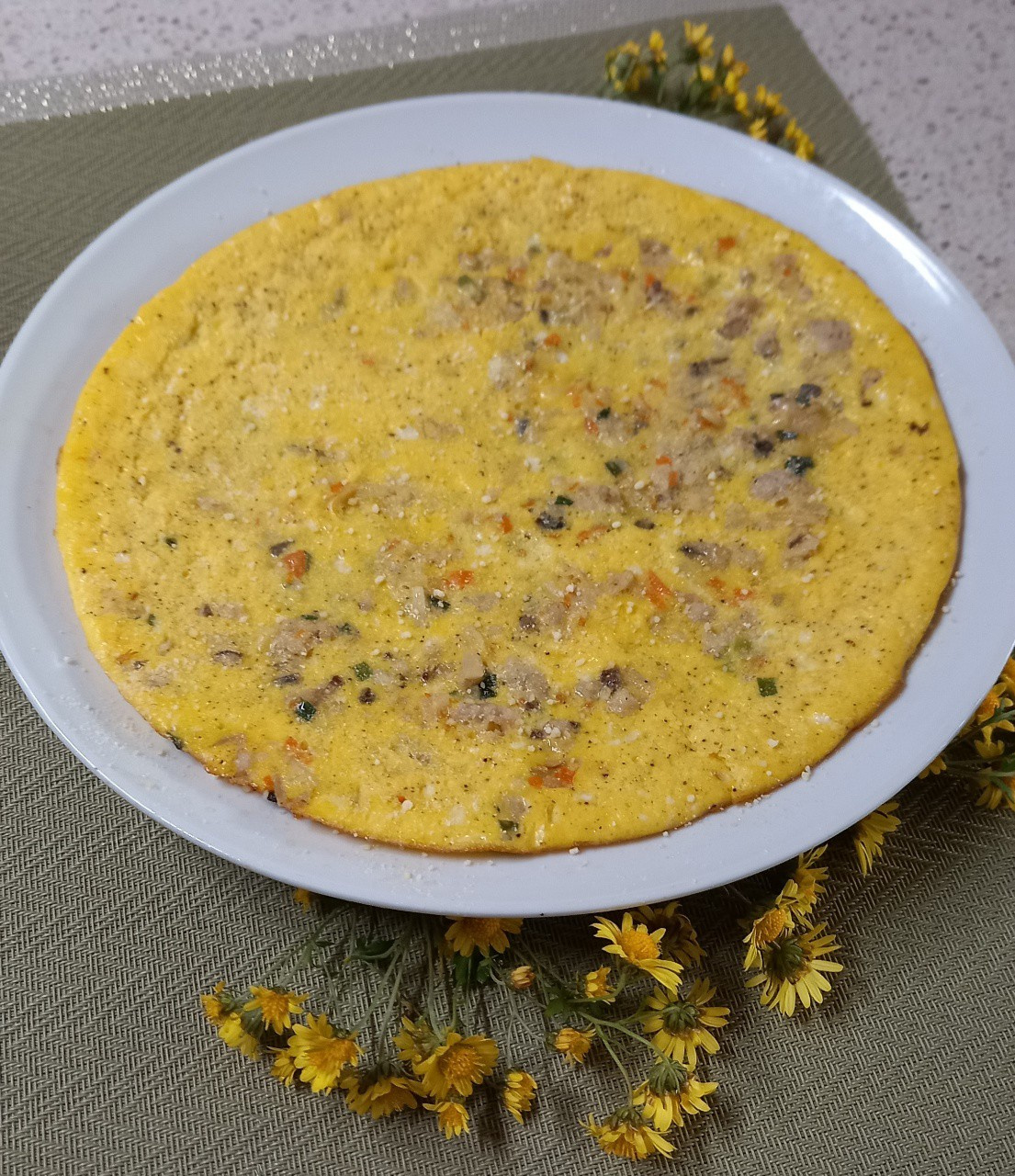 いよいよ卵液を加えて蒸す工程です。炒めたサバと野菜の上に、準備した卵液の半量を流し入れ、弱火にして、菜箸などで軽く混ぜ合わせます。卵液が半熟状になってきたら、丸く形を整えます。その後、残りの卵液を全体に均等に流し入れます。蓋をして、弱火で13~15分ほど、じっくりと蒸し上げます。弱火でゆっくり蒸すことで、中までふっくらと仕上がります。