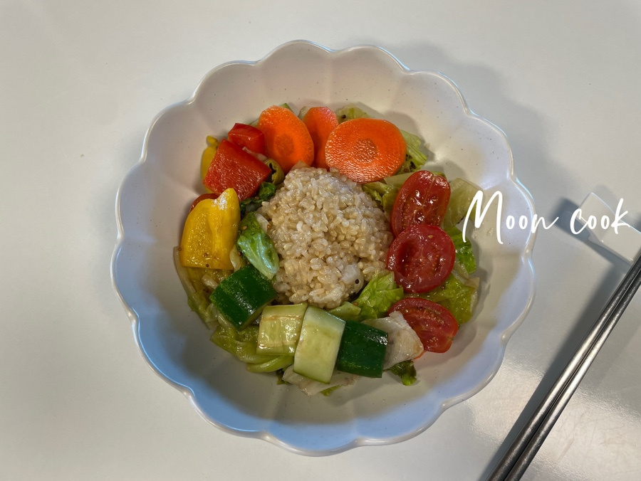 完成したサラダポキを、温かい玄米ご飯の上にたっぷりと乗せてください。栄養満点のサラダポキを、満足感のある一食としてお楽しみください。健康的で美味しいポキで、元気いっぱいの1日をスタートしましょう!