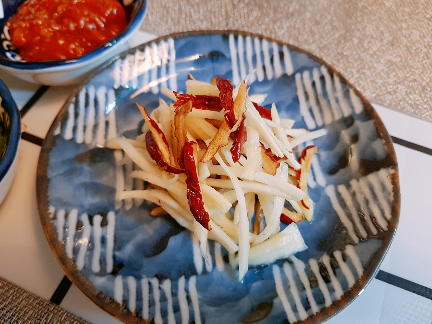 体に良い朝鮮人参(スサム)、香りの良い桔梗の根(ドラジ)、そして甘いナツメ(デチュ)を、黄金比率でハチミツと和えた栄養満点の副菜です。季節の変わり目の風邪予防はもちろん、喉の健康にも抜群の効果を発揮するこの特別な健康副菜で、ご家族の健康を守りましょう。食欲をそそる爽やかな味と、もちもちとした食感が絶品です。