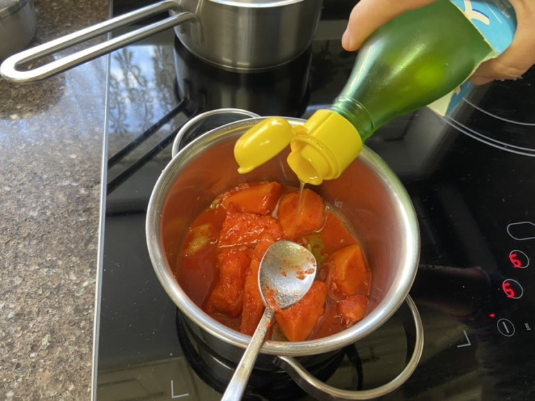 炒めているカクテキに、頭と内臓を取り除いた煮干しを10尾ほど加えます。少量の水を加えて、煮干しから旨味が出るように煮込みます。煮干しの深いコクと、熟したかぼちゃのほっくりとした甘みが合わさり、キムチチゲのような、あるいは素朴な田舎料理のような味わいが生まれます。煮干しは取り出さずに、一緒に食べるのがおすすめです。かぼちゃの甘みと煮干しの旨味が絶妙なハーモニーを奏でます。