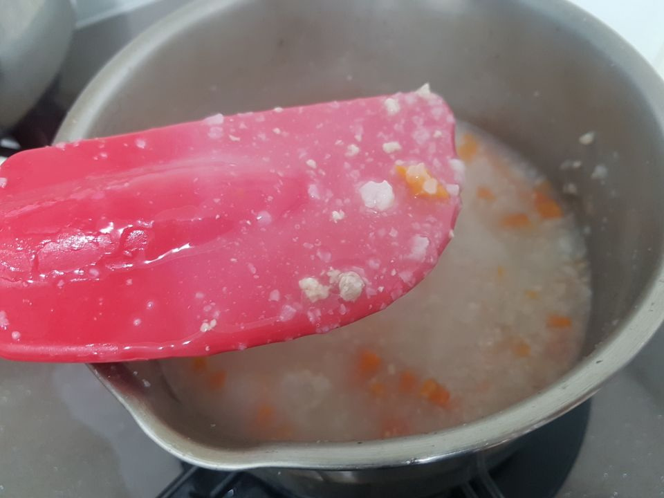 おかゆがぐつぐつと沸騰したら、弱火に落とします。弱火でも焦げ付かないように、優しく混ぜながら煮込み続けてください。