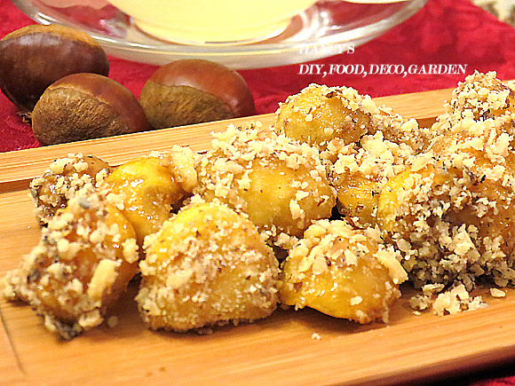最後に、煮詰めた栗を準備したナッツの粉の上に乗せ、全体にまんべんなくまぶします。ナッツの粉が栗の表面にきれいに付いたら、見た目も美しい美味しい晩茶の完成です!冷ましてからお召し上がりいただくと、より一層美味しくなりますよ。