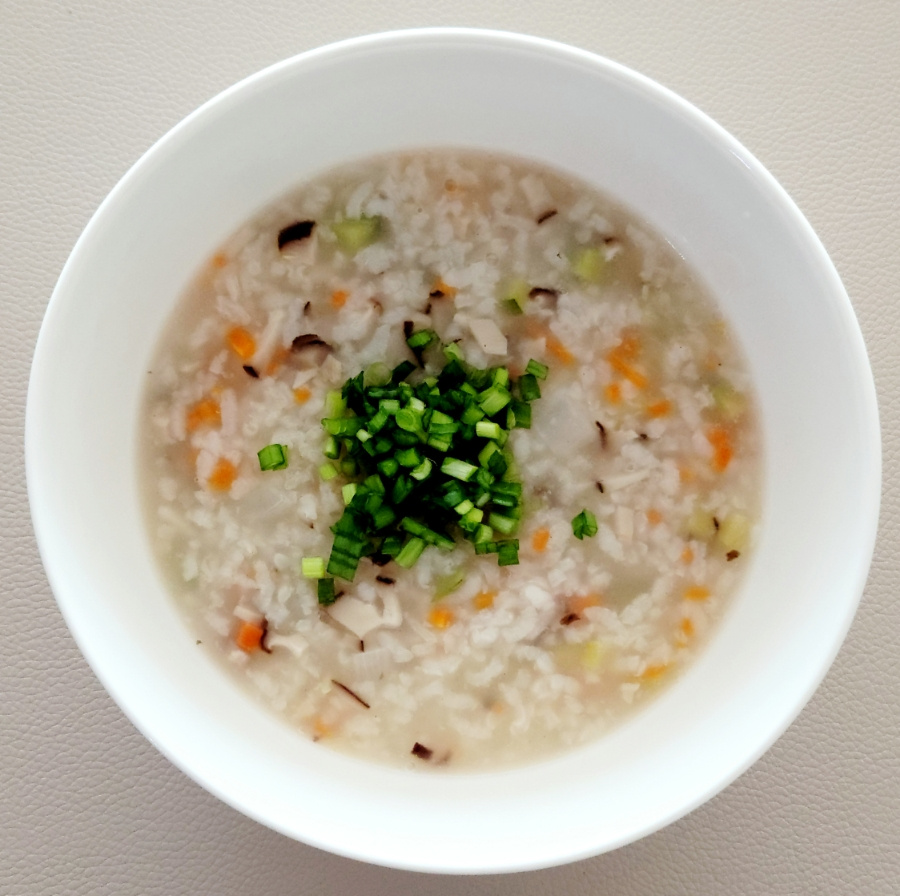米粒が柔らかくほぐれ、野菜もしっかり煮えて、美味しいお粥の形が完成しました。