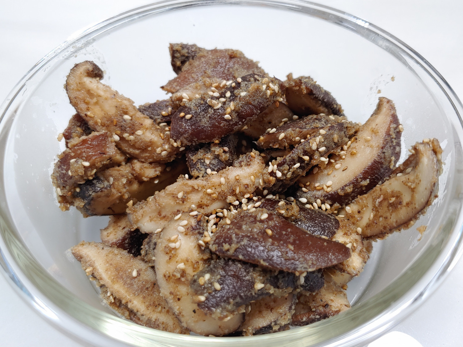 韓国の家庭料理の定番!もちもちの干し椎茸と香ばしいえごまが絶妙なハーモニー、干ししいたえごま和えのレシピ