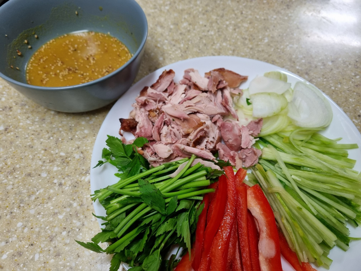 昨晩食べきれなかったスモークチキンと、冷蔵庫にある野菜を使って、彩り豊かで味わい深い鶏肉の冷菜を作ってみませんか?甘酸っぱくピリッとした特製ドレッシングが食欲をそそり、食卓を華やかにしてくれます。特別な日だけでなく、普段の食事にもぴったりな一品です。