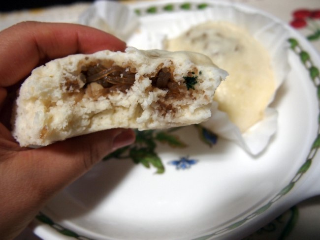 湯気が立ち上る、美味しそうなチャプチェ饅頭の完成です!温かいうちにいただくと、ホットケーキミックスのもちもちとした生地と、チャプチェの旨味が絶妙にマッチします。お正月の残り物を美味しく活用できる、素晴らしい一品です。