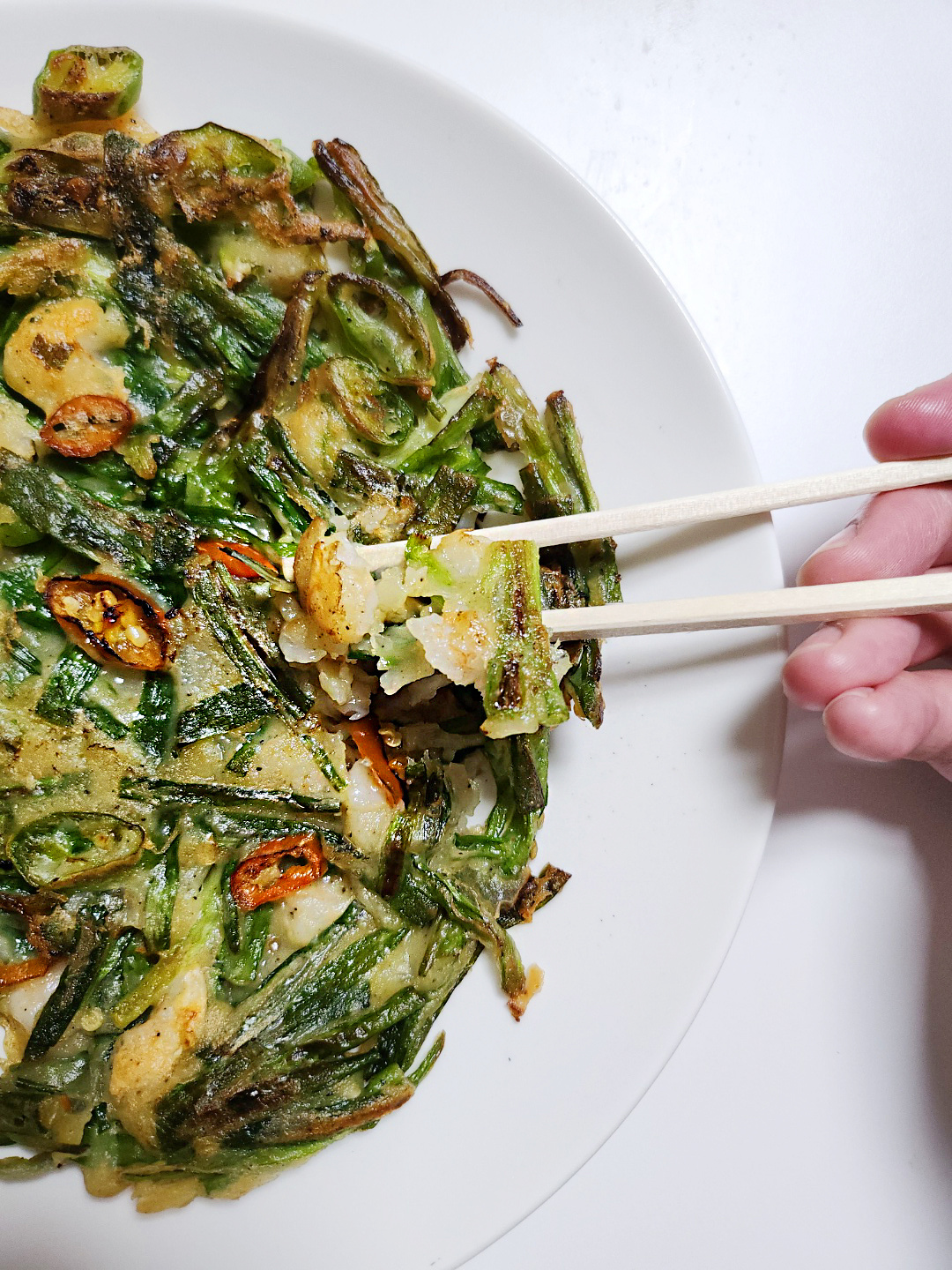 香ばしい油の香りと共に、美味しい海鮮ニラチヂミが完成しました!赤唐辛子の赤色が鮮やかで食欲をそそります。一人で食べるには十分な量で、二人でシェアするおかずとしても満足できる量です。外はカリッと、中はふっくら、プリプリのエビとピリッとした唐辛子がアクセントになり、飽きのこない美味しさです。