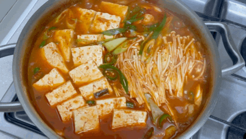 最後に、準備しておいた豆腐、エノキダケ、小口切りにした長ネギと青唐辛子をすべて加えます。材料を加えたら、中強火で約10分ほどさらに煮込み、豆腐が柔らかくなり、スープの味がしっかり染み込むようにします。すべての材料が調和して美味しくなったら、食欲をそそる豚キムチチゲの完成です!温かいご飯と一緒に、熱々を召し上がれ!