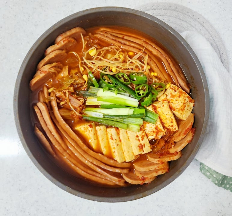 最後に、10分経ったら蓋を取り、切った長ネギと青唐辛子を加えます。さらに数分煮込んで、長ネギがしんなりしたら完成です。(ラーメンを入れる場合は、このタイミングで一緒に煮込みましょう!)具材に火が通り、スープが程よく煮詰まったら、熱々の美味しいプデチゲの出来上がりです!