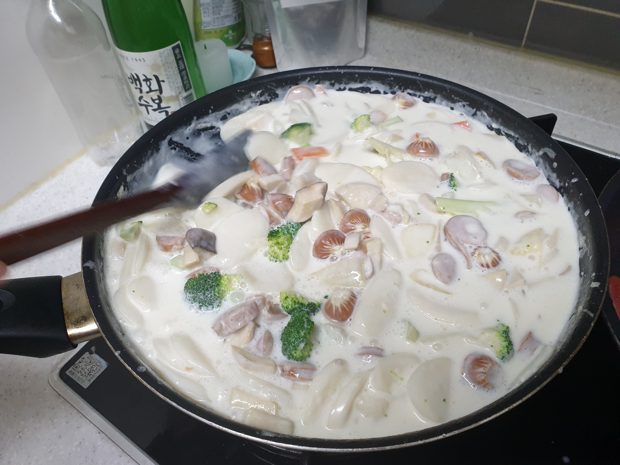 次にクリームソースを作ります。具材を取り出したフライパン(またはきれいな鍋)に、牛乳700mlと生クリーム300mlを注ぎ、水で戻したトックク用のトックを加えます。中弱火にかけ、トックが煮えてソースにとろみがつくまで、絶えずかき混ぜながら煮詰めます。トックが鍋底にくっつかないように、絶えず混ぜ続けることが重要です。