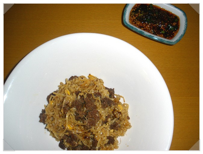 ご飯が炊き上がったら、牛肉ともやしを全体に混ぜ合わせます。温かいご飯を器に盛り付け、作った合わせ調味料(タレ)をかけて混ぜながらお召し上がりください。どうぞ、美味しく召し上がれ!