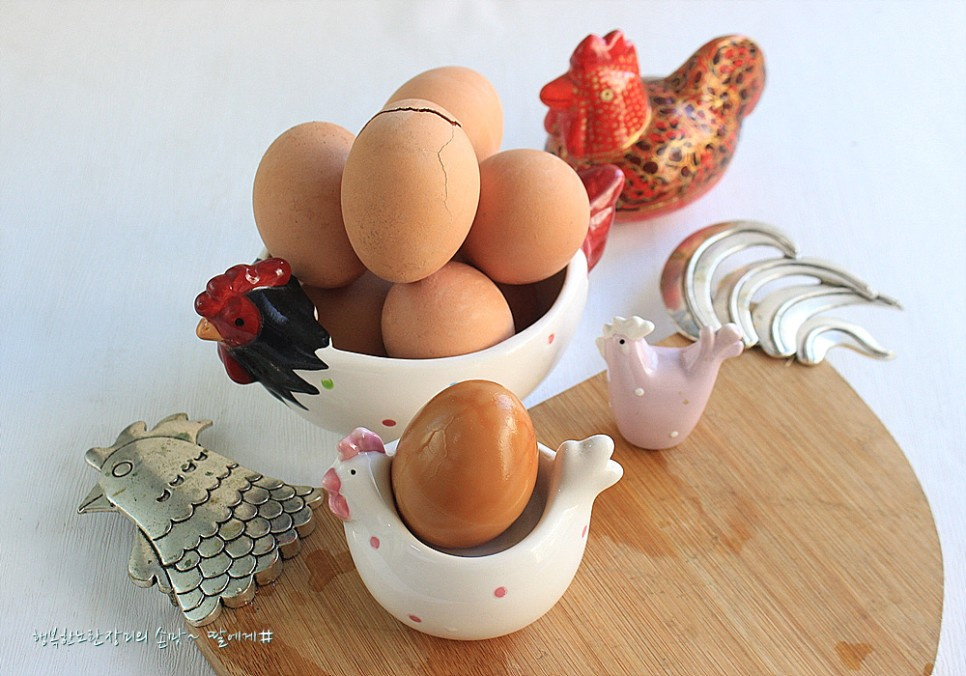 とても美味しそうな色の焼き卵ができましたね!半分に切ってみると、中まで均一に色が染み込んでいるのが確認できます。完成した焼き卵は器に盛り付け、小腹が空いた時に一つずつ取り出して食べると最高です。サラダに添えたり、ビビンククスに入れたりしてタンパク質を補給するのも良いでしょう。コストパフォーマンスの良い、素晴らしいタンパク質源です!
