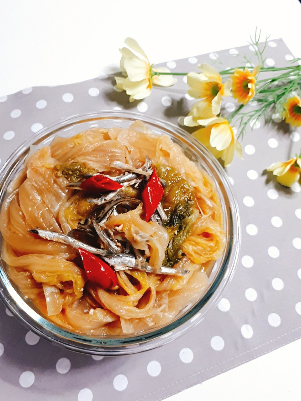 出汁の旨味を加えるための昆布1掴みと、ピリッとした辛味を加える赤唐辛子(または青唐辛子)を入れます。私はコクを出すために、うま味調味料をほんの少し加えました。苦手な方や、お持ちでない場合は省略しても構いません。