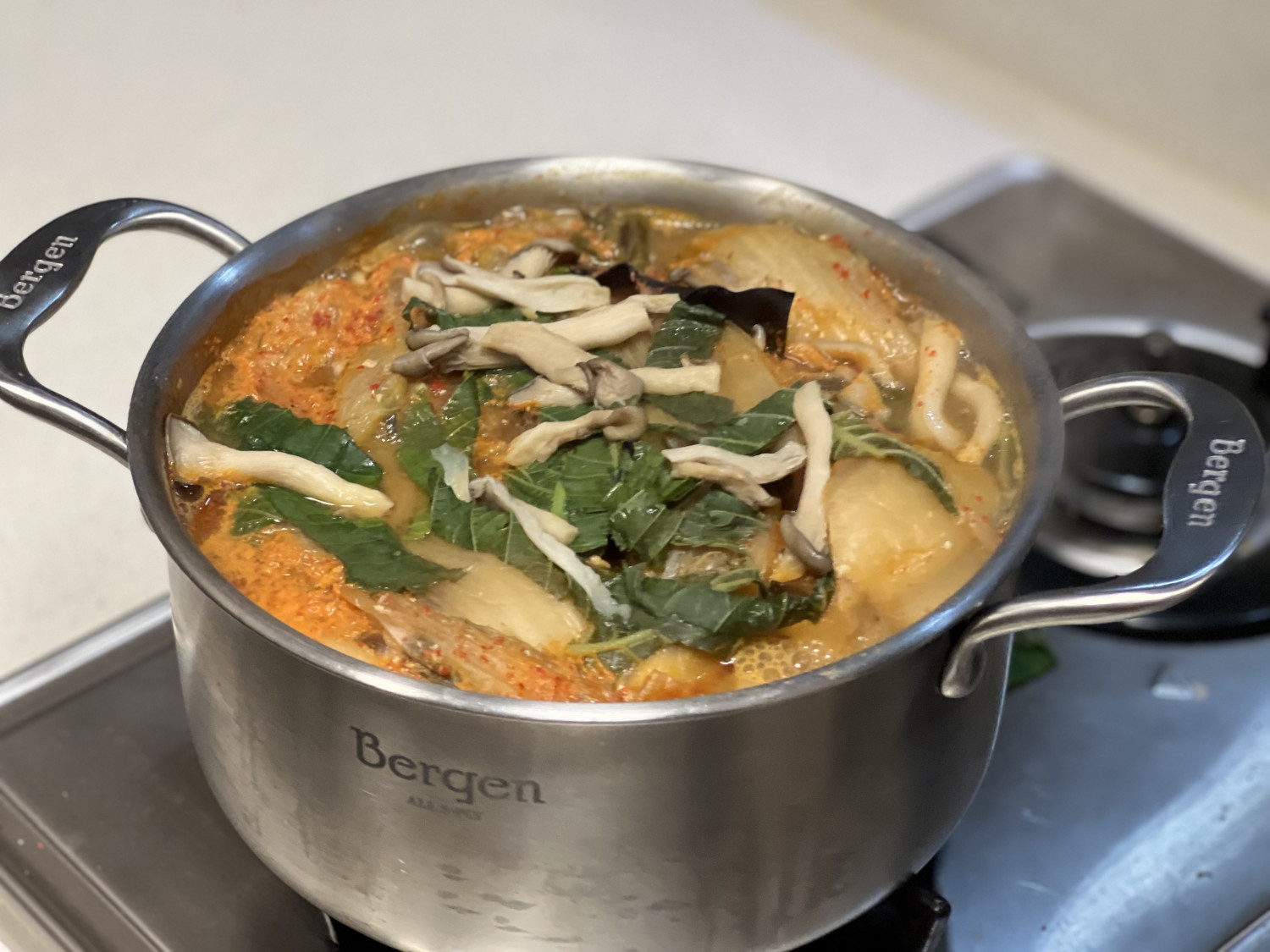 スープがぐつぐつと煮立ったら、用意したきのこやエゴマの葉を入れ、火を弱火にして、蓋をして最低1時間以上、お肉が骨からほろっと外れるまでじっくり煮込みます。お肉が十分に煮えたら味見をして、薄ければ塩で調整してください。最後に、エゴマの葉粉をたっぷり加えて、香ばしく濃厚な味に仕上げます。