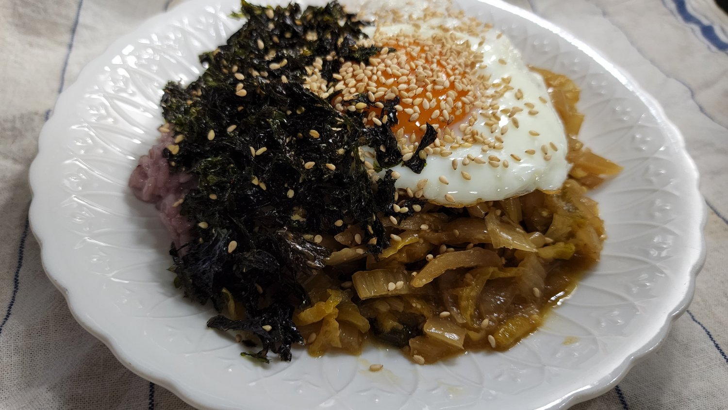 器にごはんを盛り、その上に美味しく和えた熟成キムチの和え物をたっぷりのせます。目玉焼きを乗せ、最後に香ばしい刻み海苔と炒りごまを散らせば、見栄えの良い熟成キムチの和え物ビビンバの完成です。よく混ぜて、美味しく召し上がってください!