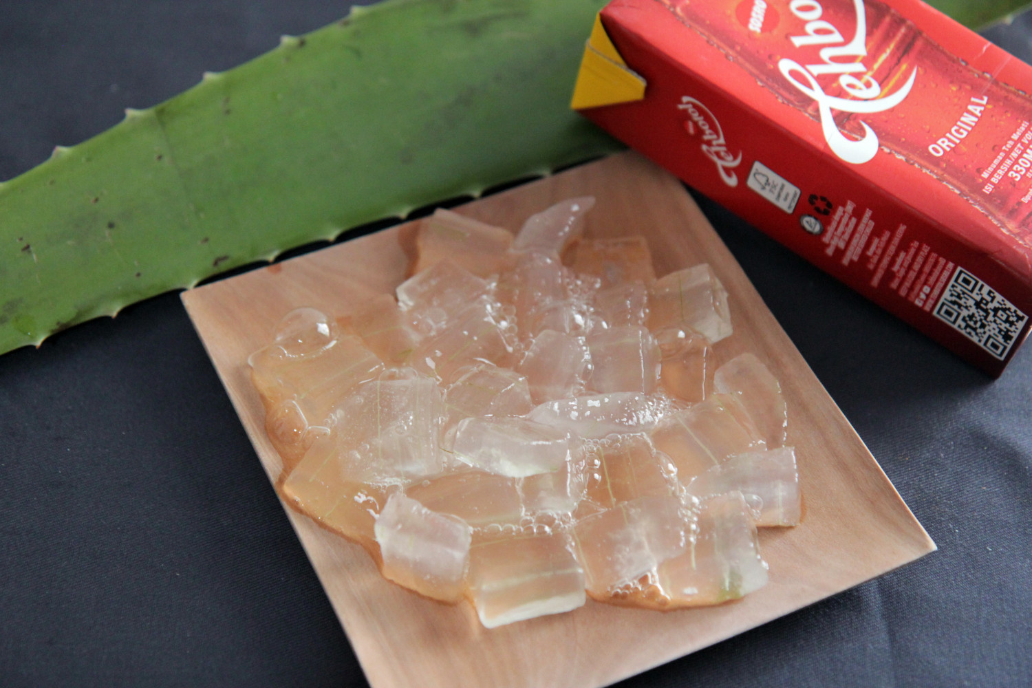 きれいに下処理したアロエは、食べやすい一口大(約1.5〜2cm)に切ってください。薄すぎると崩れやすくなるので、適度な厚さに切ってシャキシャキとした食感を活かすのがポイントです。