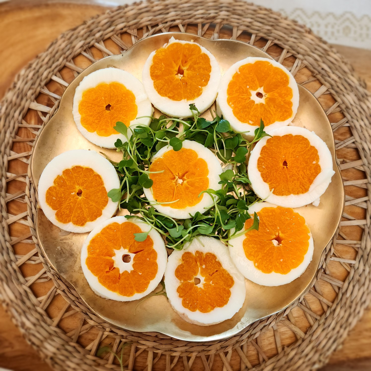 最後に、新芽のような緑色の野菜を少し添えると、さらに爽やかな印象になります。爽やかなデザートや特別な日のゲスト用メニューにぴったりのみかんようかん。みかんが旬の冬にぜひ作ってみてください。子供も大人もみんな大好きになるはずです!